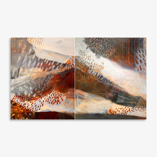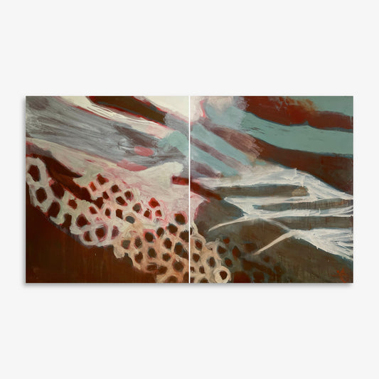 This abstracted landscape acts as an energetic backdrop, extending the world created within his paintings and ceramics. The series draws upon colours and forms encountered during road trips from Sydney to Adelaide, across the mid-west of America, and into Canada. These journeys were undertaken as part of Elk’s ongoing practice of sketching and painting the landscape, culminating in the Dusk + Dust series. Initiated following the loss of his father, the series serves as a meditation on grief and its emotional processing. Within this body of work, life is represented as a landscape in motion, with colour symbolising the remnants of experience. The series captures the beauty, harshness, and vitality of uniquely Australian landscapes, juxtaposed with the snow-covered terrains of North America.