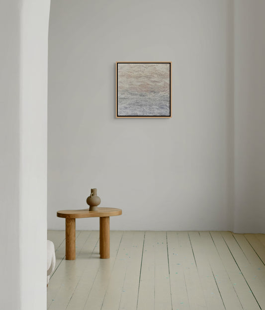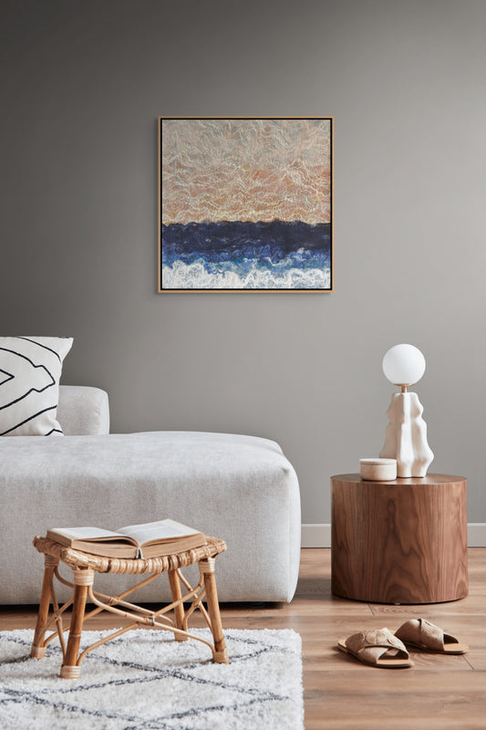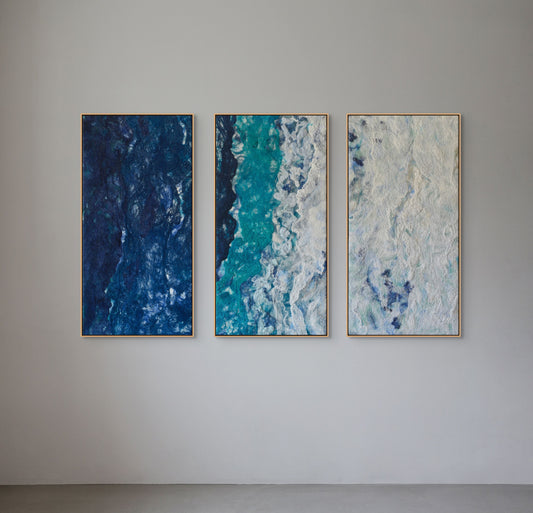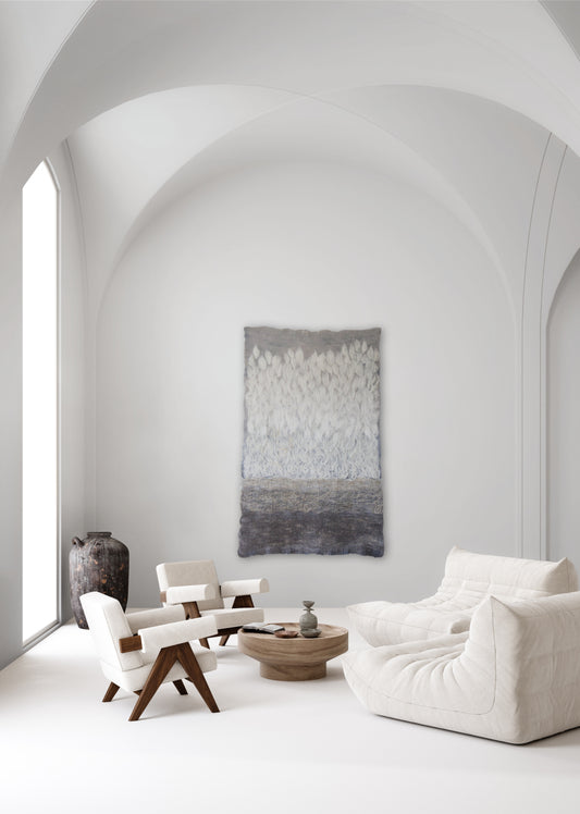 Susie Hughes is a fibre textile artist working from her home studio in Crescent Head, Australia, where she lives with her husband. She creates hand-felted artworks using natural, ethically sourced fibres, including silk, merino, alpaca, angora, and flax, which she sources from small farms in Australia and abroad. She draws inspiration from her love of the ocean, with surfing, sailing and meditation an integral part of her lifestyle. Susie aims to capture the inner beauty of the natural environment. By layering different textures and tones and merging forms from different perspectives, she creates artworks that convey a sense of calm, warmth and softness in their architectural spaces.
