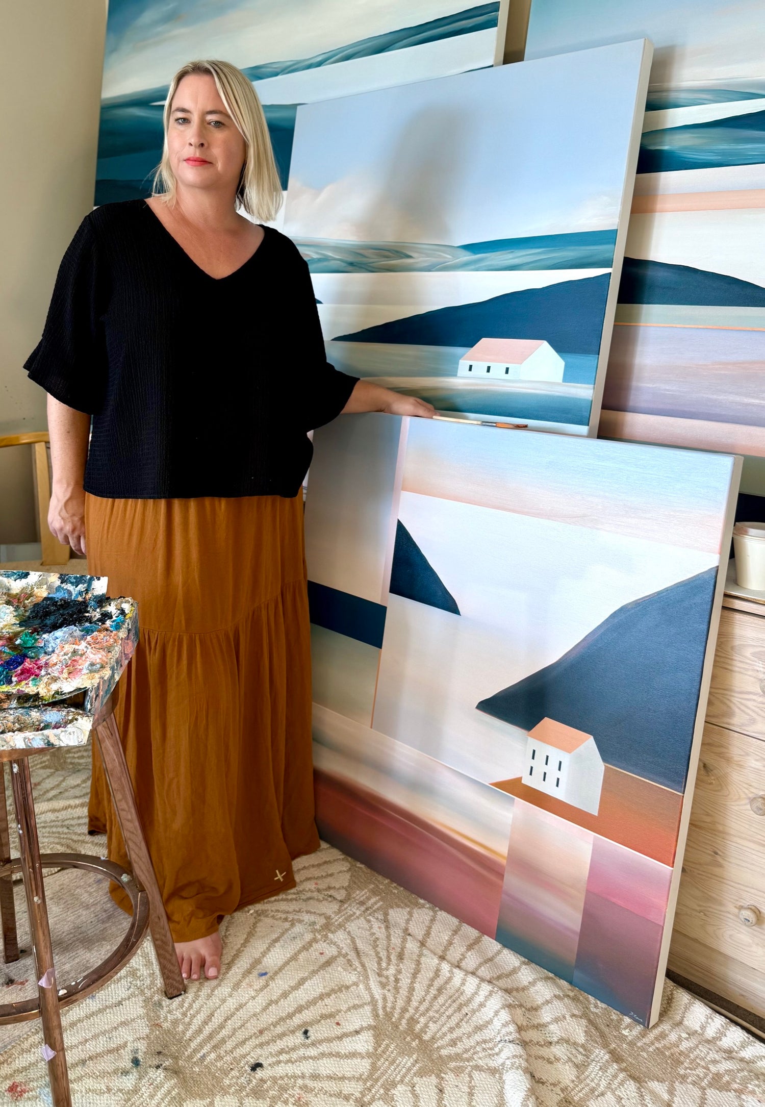 Kelly Rowe is a contemporary landscape artist based in Auckland, New Zealand, whose work seamlessly blends architecture, design, and fine art. With a background in architecture and interior design experience in Sydney and London, Kelly offers a nuanced perspective on landscapes, delving into the connections between human emotion, place, and identity.