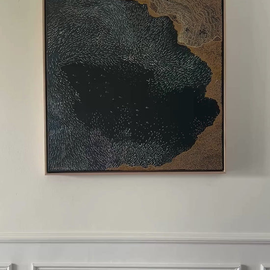 The ‘Resonance’ Collection This collection of emotive landscapes explore the tension and connections between people, land, ocean, and spirit. Through darker tonal palettes, rippling textures, and layered abstraction, these works express a dialogue between movement and stillness. Each piece reflects a contemporary First Nations expression of place, drawing upon ancestral memory and the living energy of Country. There is both intimacy and vastness in these landscapes and a sense of presence that reaches beyond the physical. These pieces invite viewers to contemplate their own relationship to the land and the unseen forces that shape it.