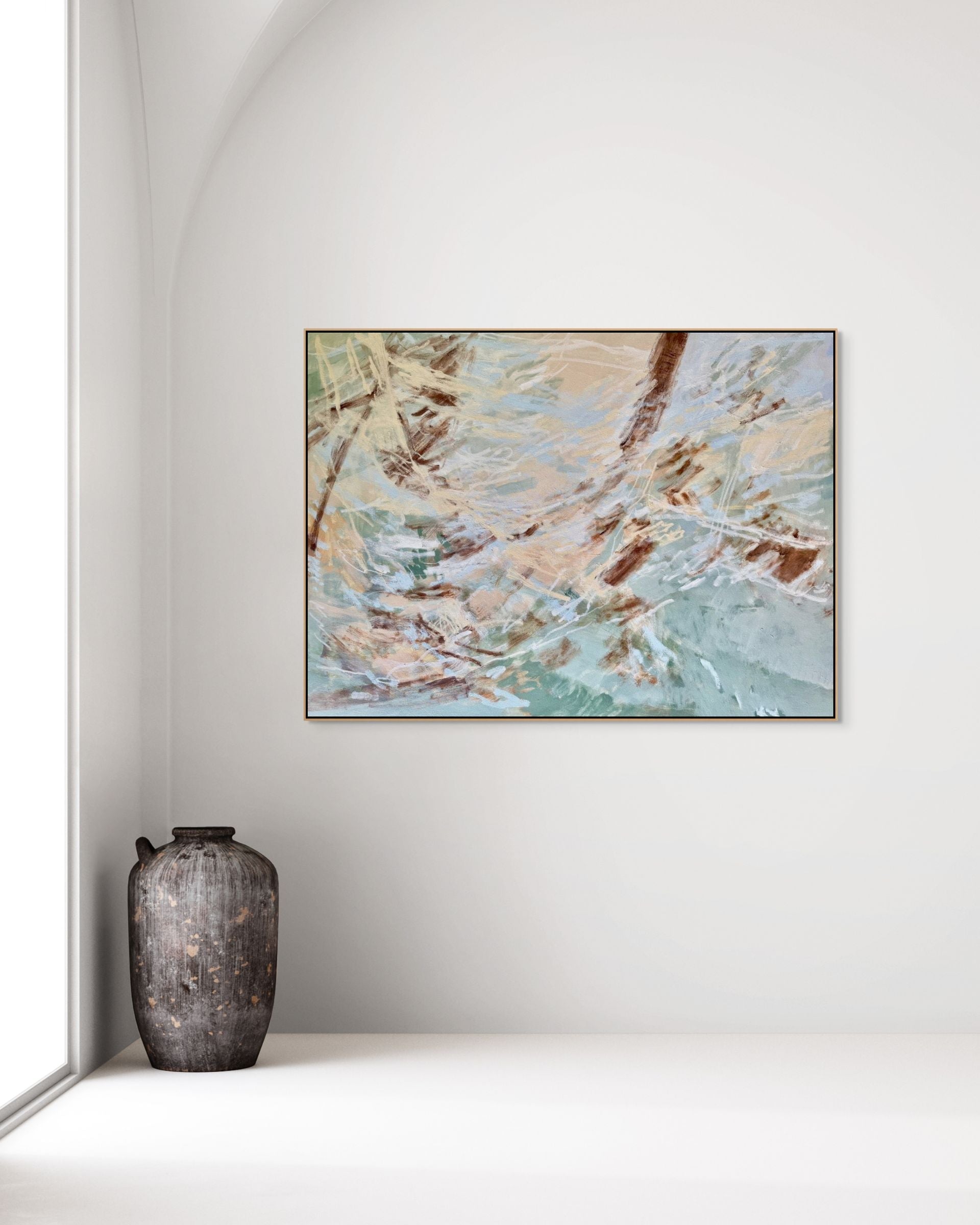 Readjusting to motherhood second time round, I’ve been embracing new life sparking a creative surge which has seen my practice leaning towards energy in abstraction and the slow exploration of interlacing brushwork of acrylic, oil sticks, and spray paint on the canvas. My intuitive painting process reveals a constant conversation with nature and nurture, forever evolving but always in flow with a sense of deep knowing and trust in the creative process of art-making and motherhood. Much like childbirth, the creative process is familiar yet of another world as the energy moves from one dimension to the next, and here we meet again.