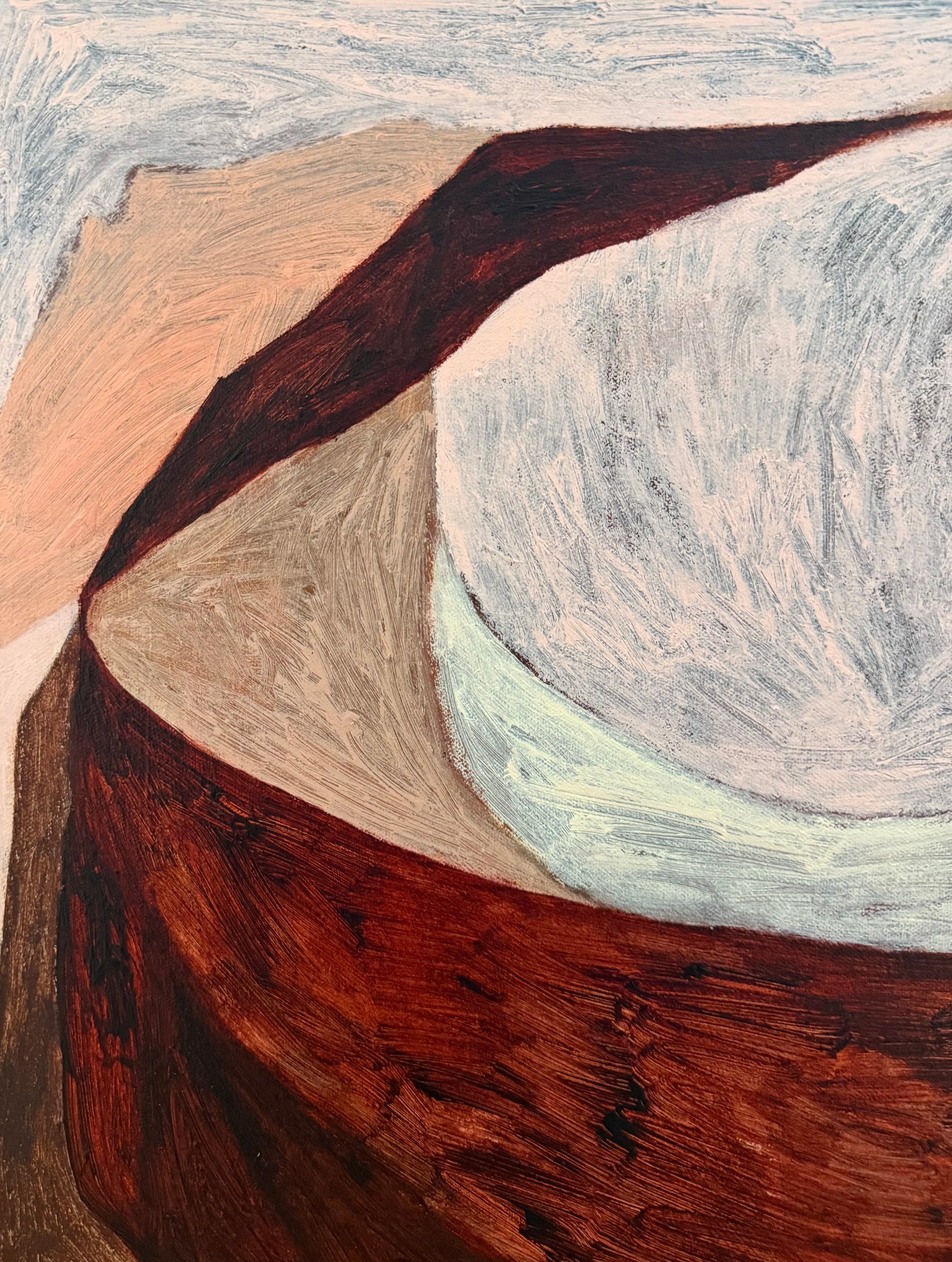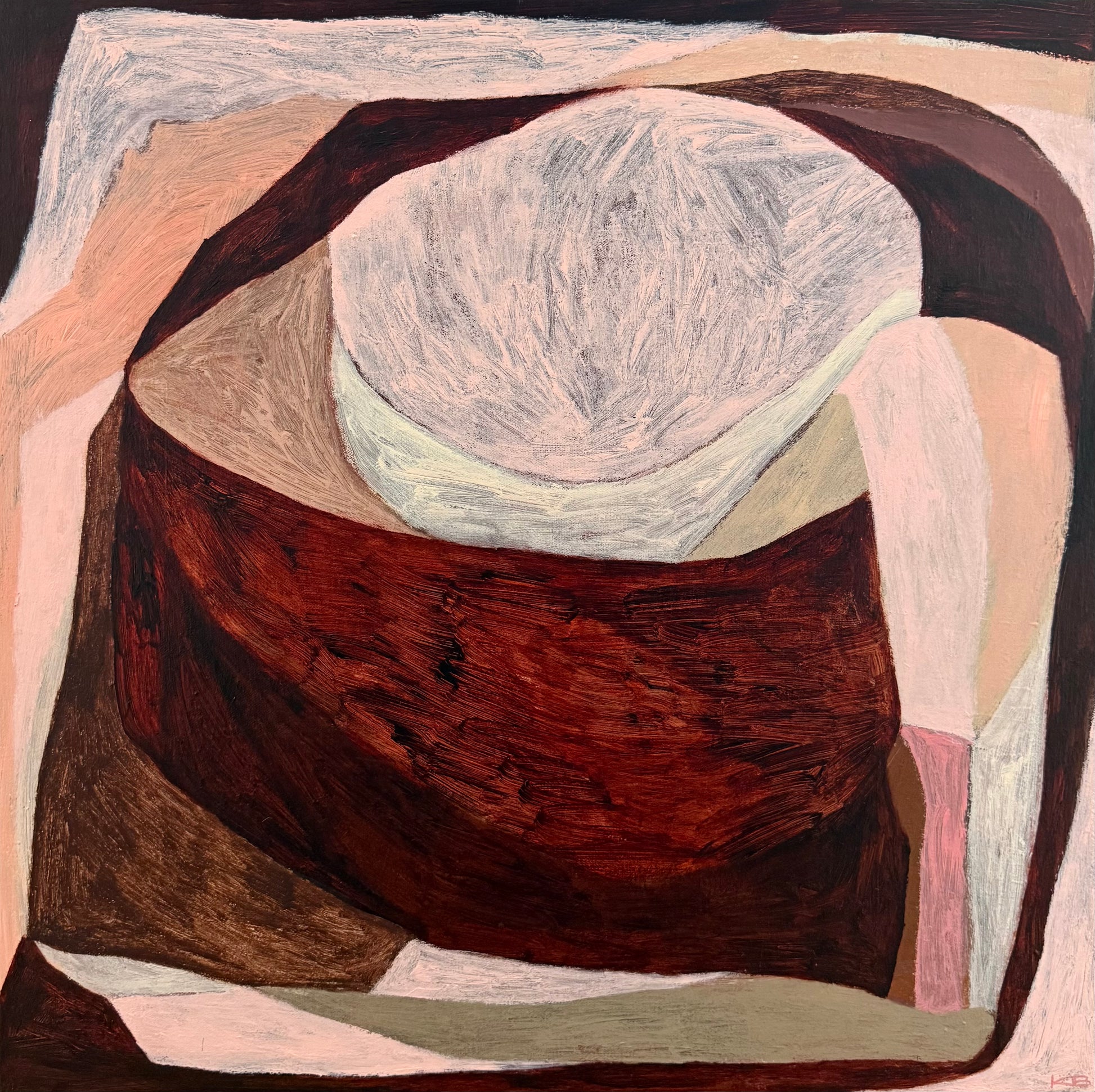 Working from her purpose-built home studio, Bradford balances her art practice with teaching and raising three young children. This intersection of creativity, care, and daily life informs the emotional undercurrents of her work—visible in recurring motifs such as fractured lines, distant islands, and shifting terrains that act as metaphors for the human experience. Her intuitive process embraces both spontaneity and structure, blending gestural mark-making with formal experimentation.
