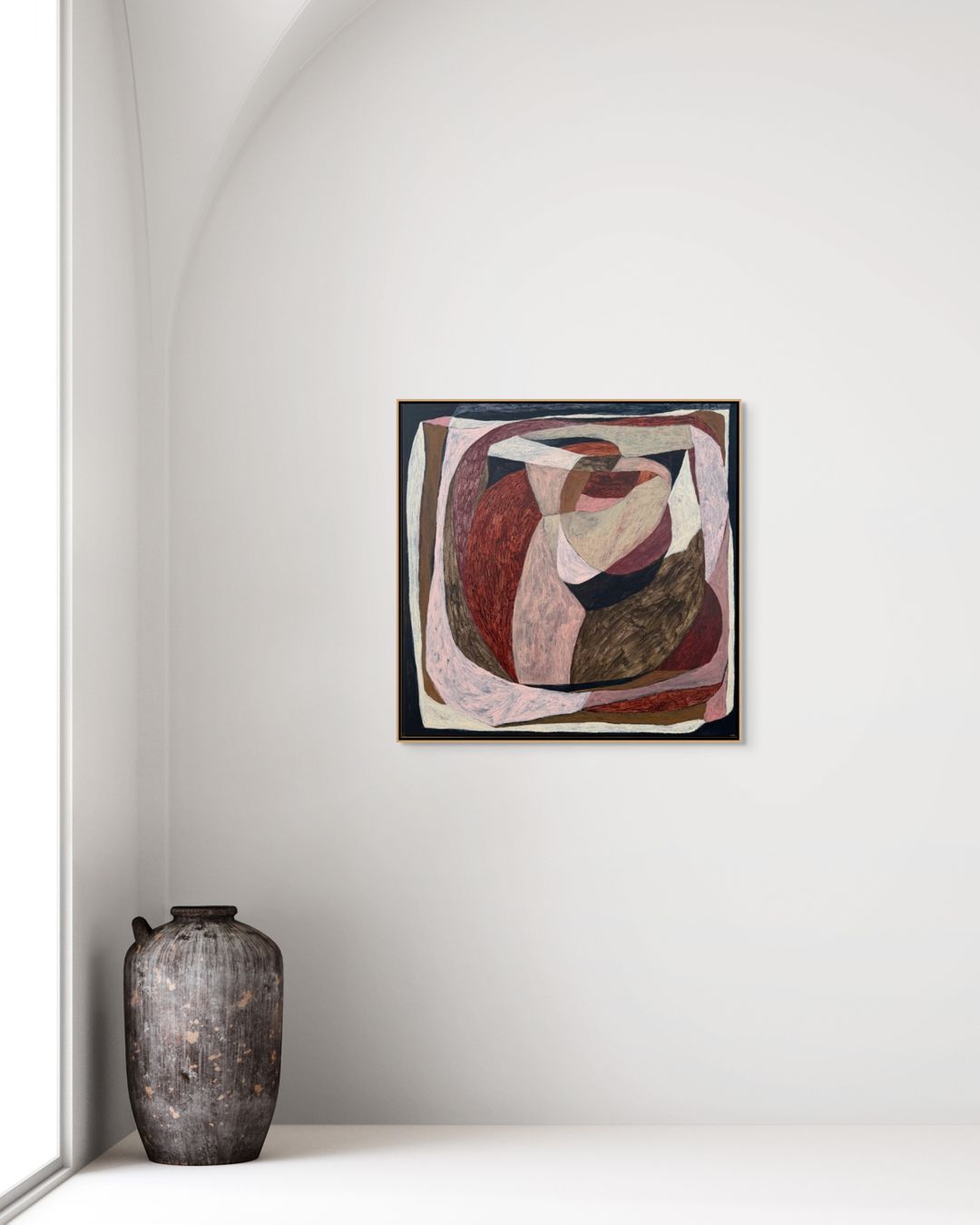Working from her purpose-built home studio, Bradford balances her art practice with teaching and raising three young children. This intersection of creativity, care, and daily life informs the emotional undercurrents of her work—visible in recurring motifs such as fractured lines, distant islands, and shifting terrains that act as metaphors for the human experience. Her intuitive process embraces both spontaneity and structure, blending gestural mark-making with formal experimentation.