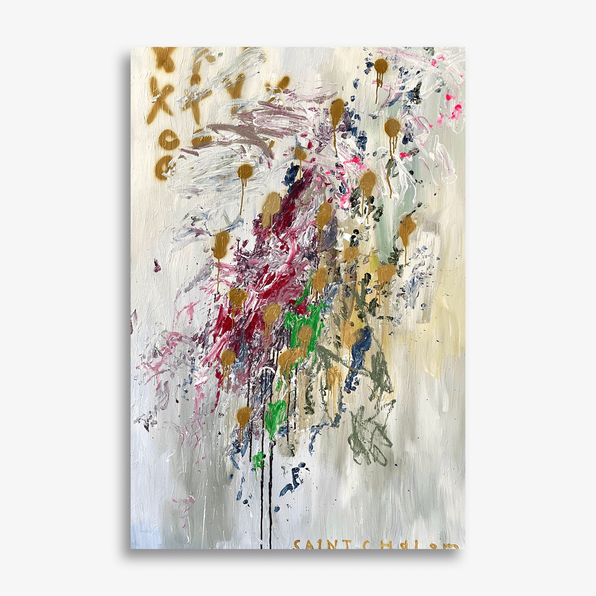 Saint Chalom, Australian artist exploring authentic spirituality through mixed-media paintings. Layers hidden blessings and prophecies with found materials, oil sticks, and gestural marks to create transformative atmospheric experiences that honour the divine nature within all.
