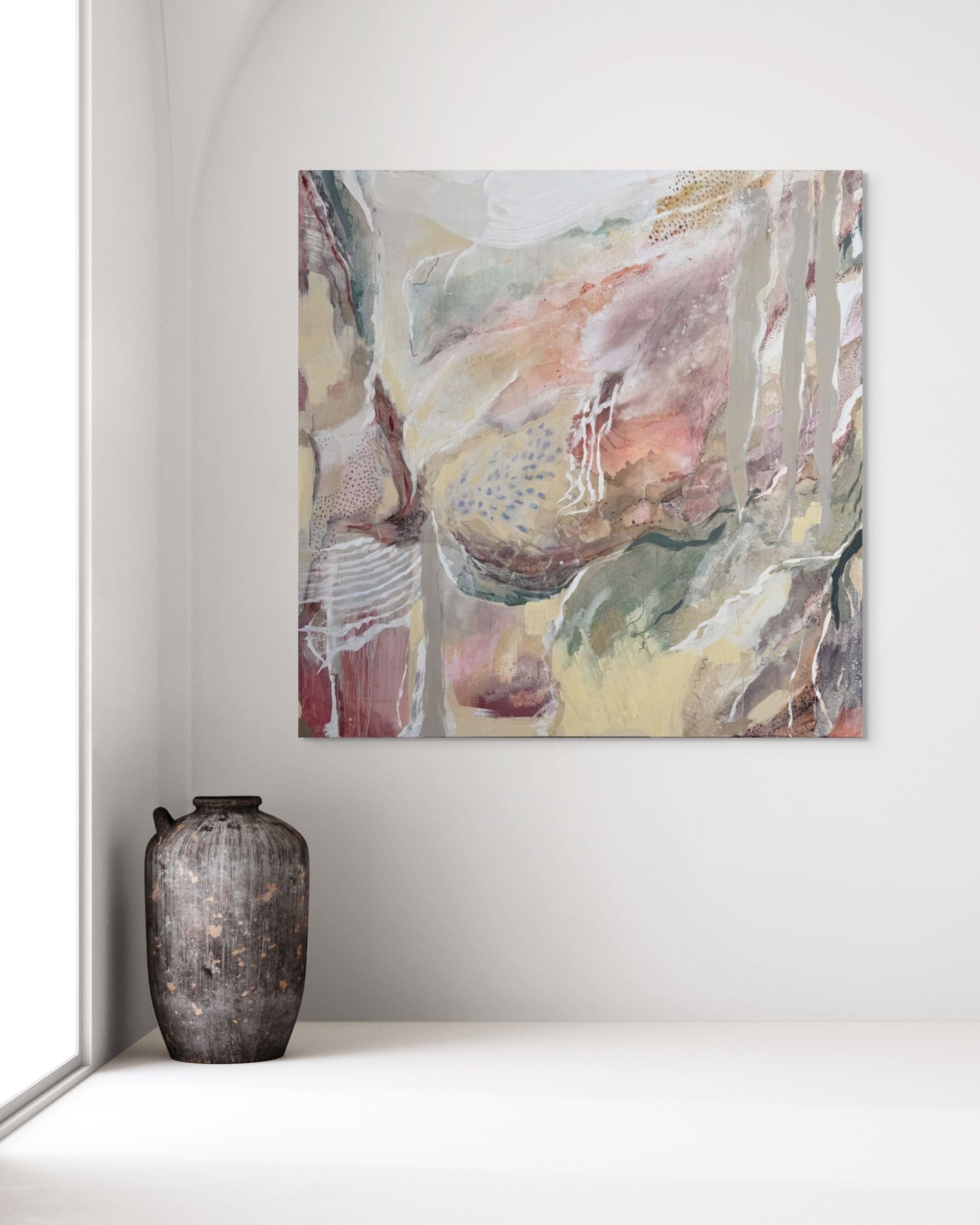 My work is shaped by the emotional solace I find from being immersed in nature and the joyful, vivid, and awe-inspiring moments we find when we really connect with the landscape. I find myself fixating on the endless repeat patterns that emerge across various scales, whether it’s the stunning abstract scenes of aerial landscapes or the micro details that repeat in stone, florals, and botanicals. My pieces are a joyful celebration and abstraction of the colour, texture, and forms we find when we truly notice, rather than only see what we expect to see. I work mainly with acrylic, mixed mediums, and oil pastels on canvas, linen, and board. The mark-making process and layering of paint and textures is an experimental study and intuitive journey that unfolds to capture these organic, complex, and expressive compositions. For me, nature and art-making are a means to process the world around us, so each piece is an emotional response to a full and vivid human experience.