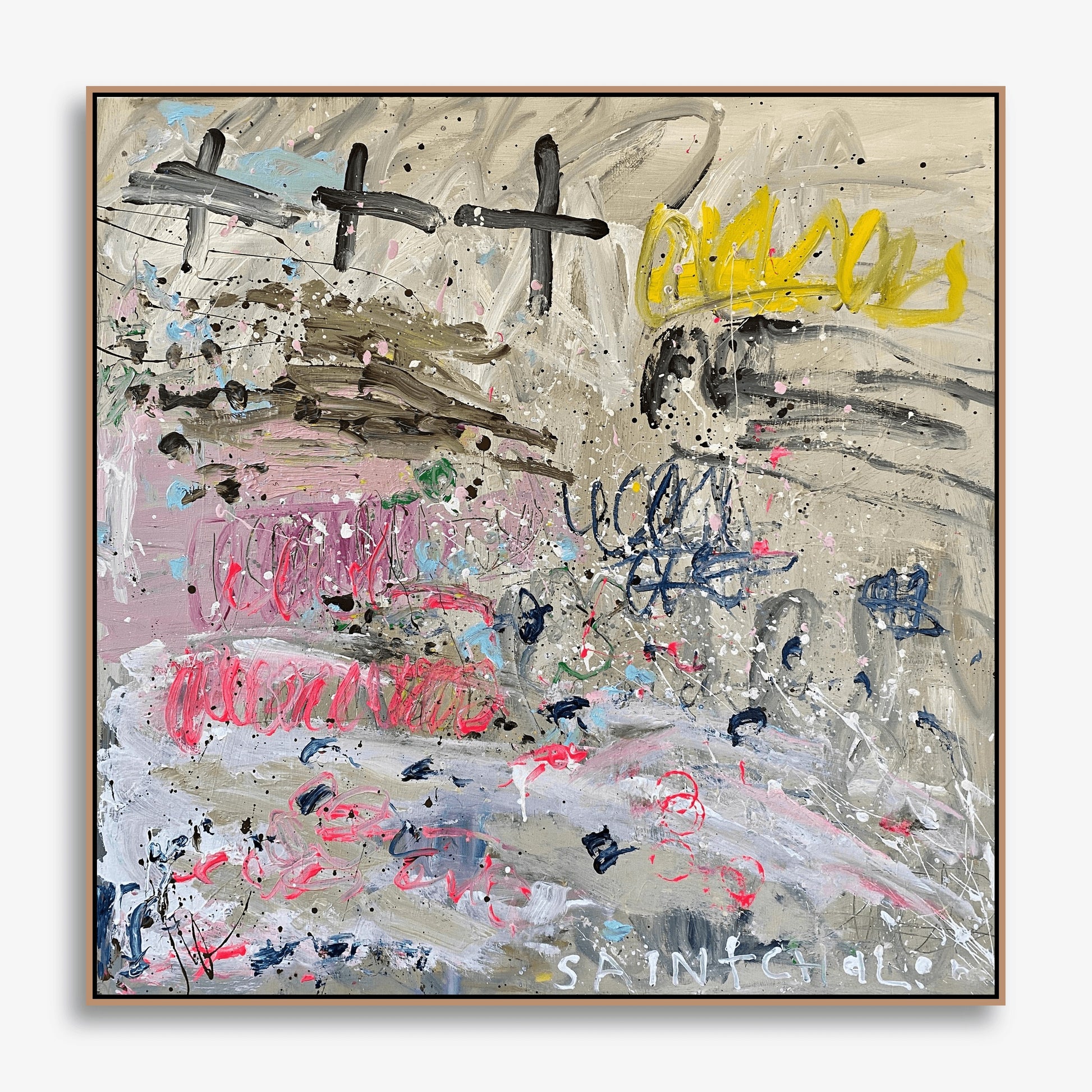Working primarily with found and recovered materials, Saint Chalom creates deeply meditative artworks that layer written blessings, prophecies, and personal reflections beneath gestural marks made with oil sticks, spray paint, and carpenter's pencils. His process deliberately eschews traditional brushes in favour of hands-on application, creating a more direct and authentic connection to the work.