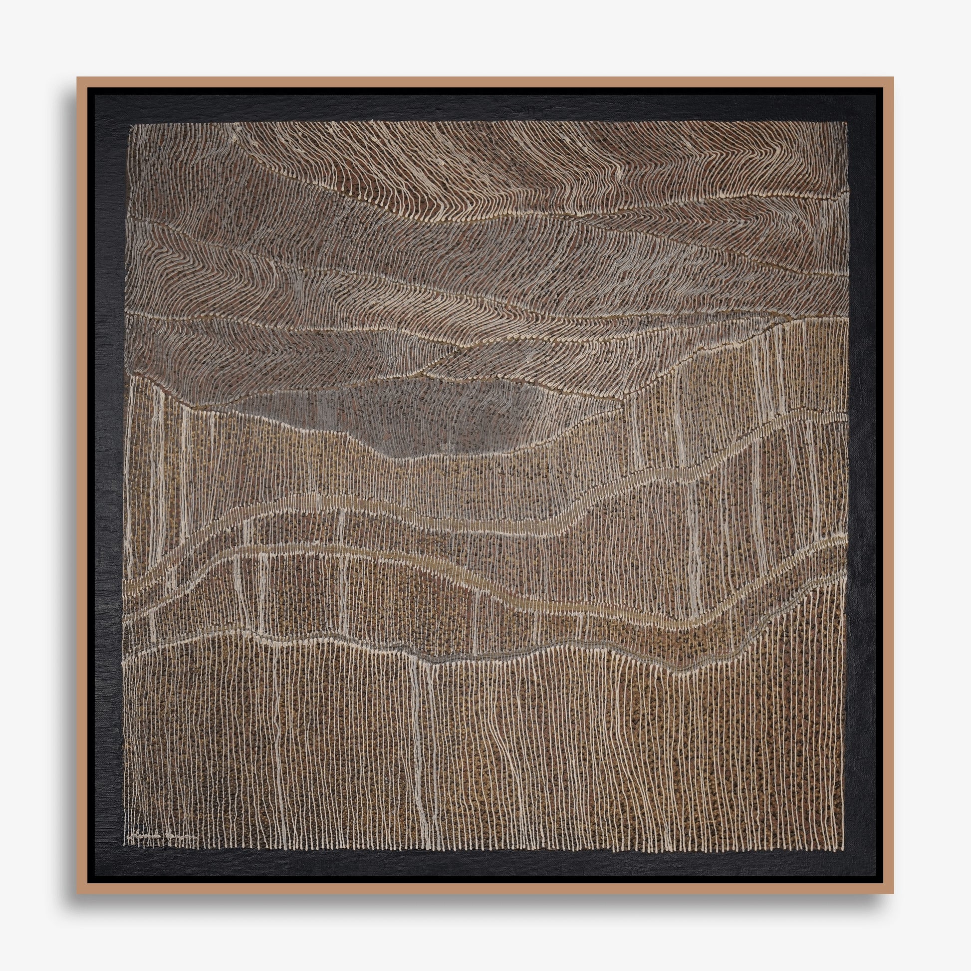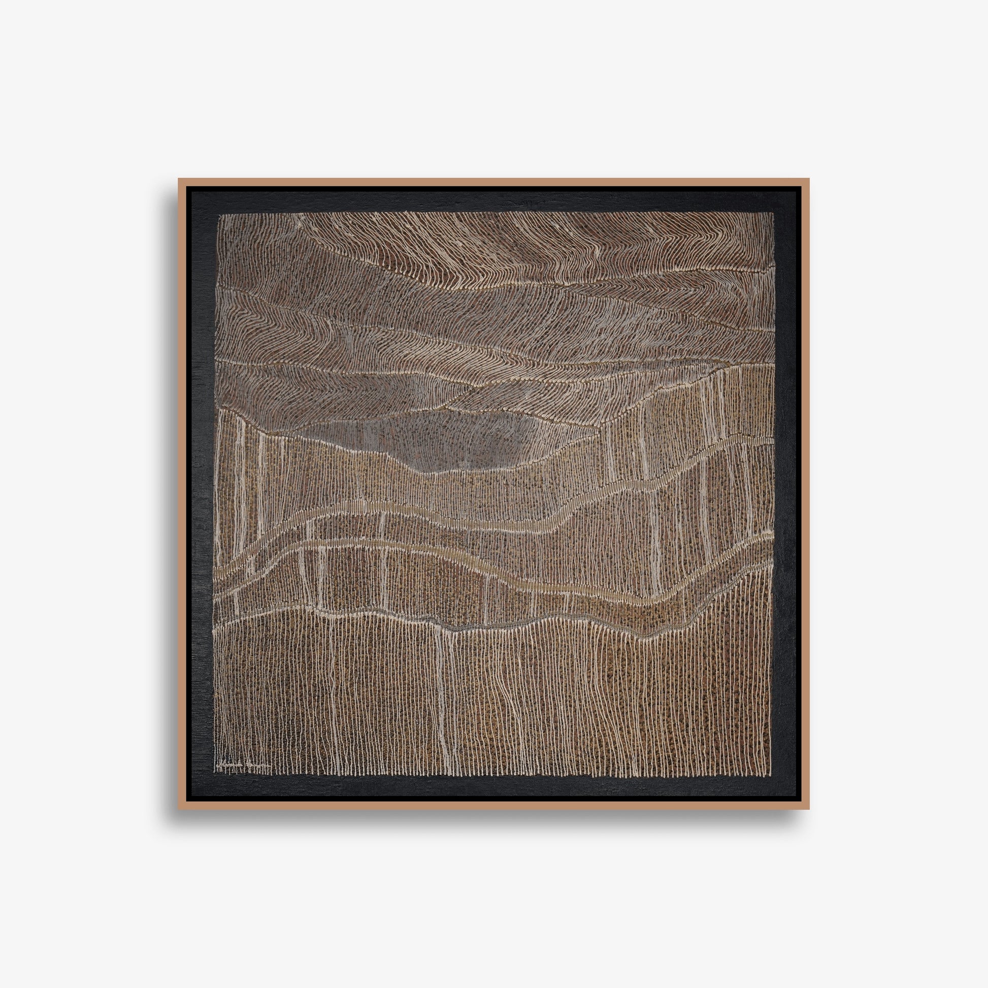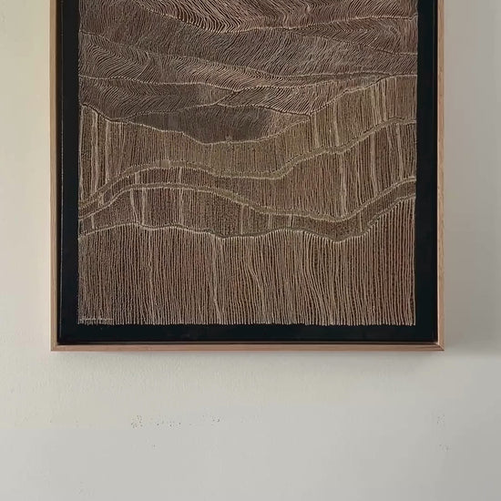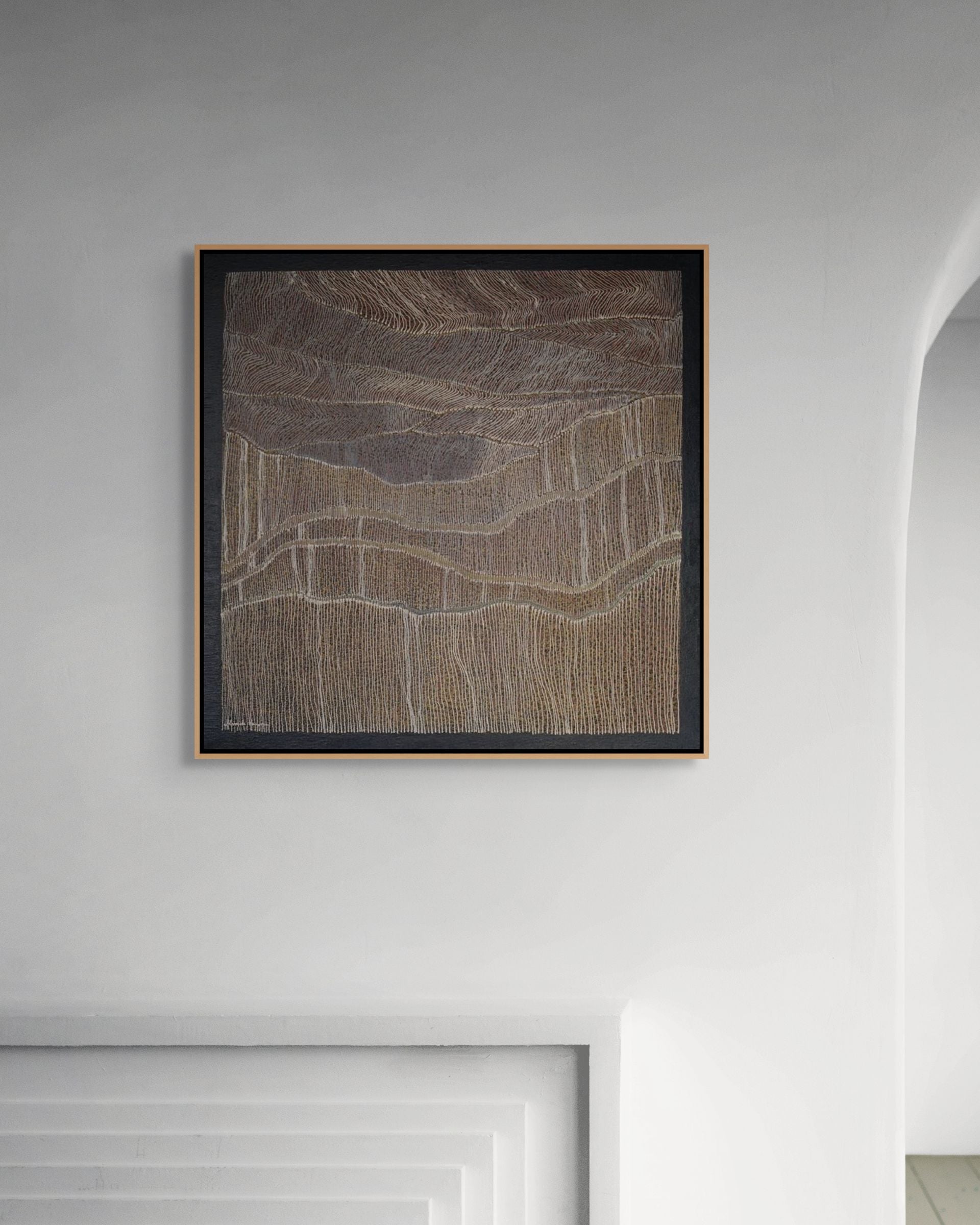 Miranda Hampson, an Aboriginal artist of Anaiwan descent, creates works that honour First Nations connections to Country. Grounded in kinship, land, and culture, her layered, rhythmic mark-making embodies healing, heritage, and the enduring relationship between people and place.