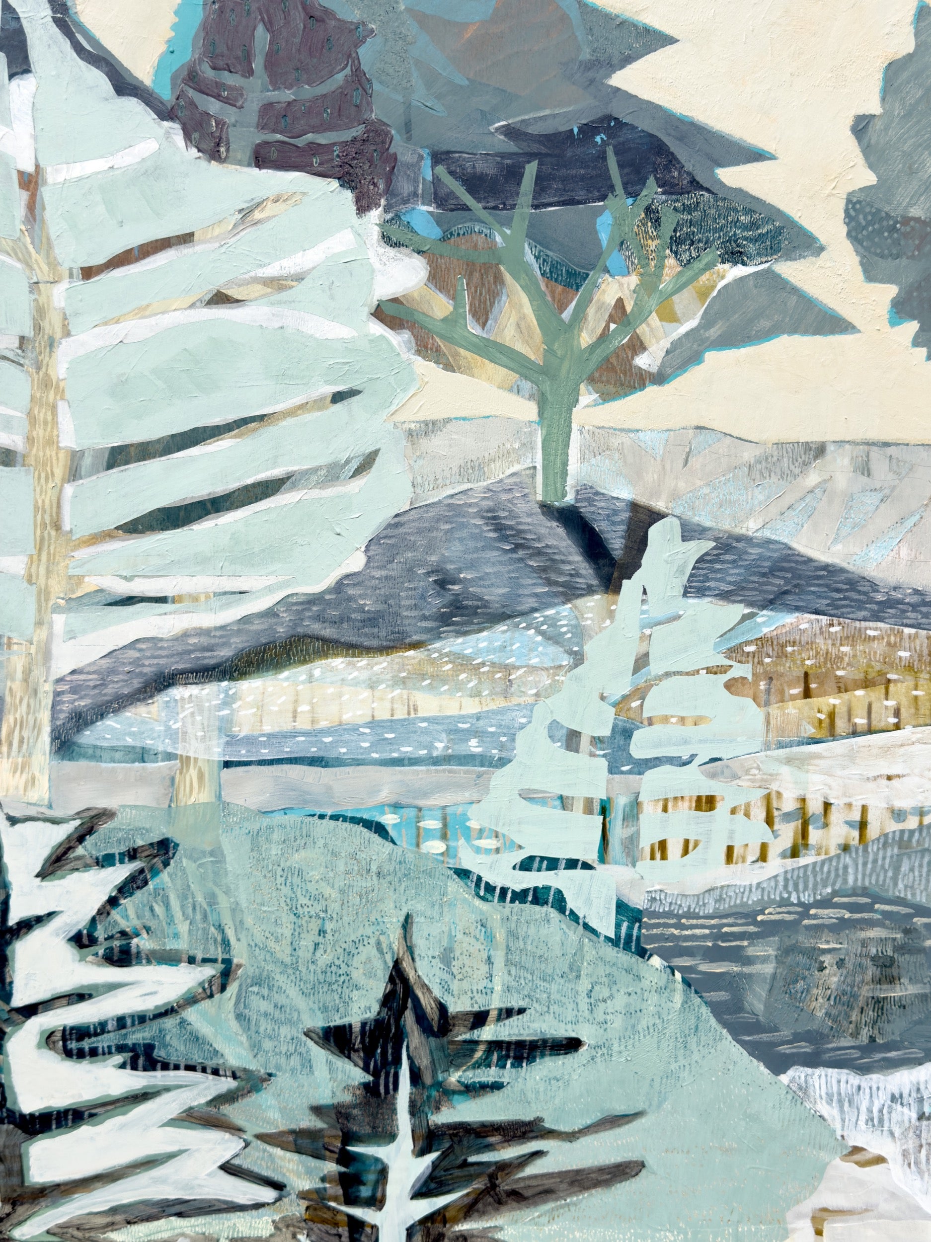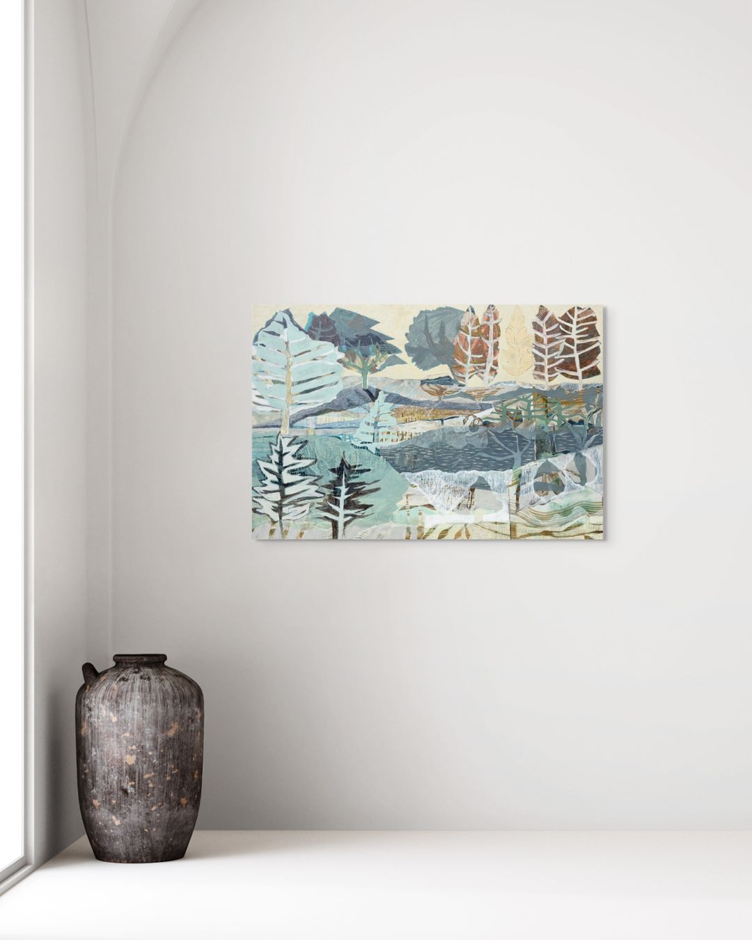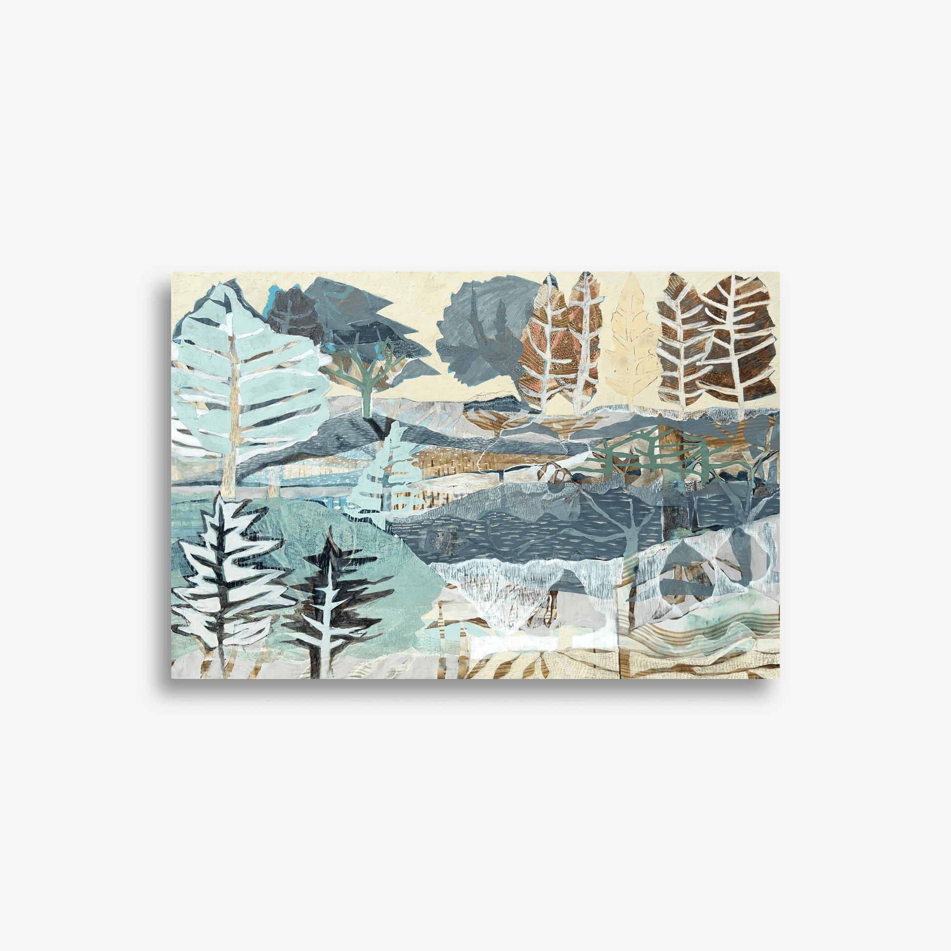 Where Dreams Begin is a textured and layered landscape that evokes a dreamlike interplay between memory and nature. Crafted with a composition almost patchwork like, a quality that feels both familiar and surreal. The overlapping layers suggest movement and depth, inviting viewers into a contemplative world where boundaries blur between reality and imagination. This work captures a gentle stillness, encouraging a reflective pause-as if you have wandered into a serene woodland where stories might quietly unfold.