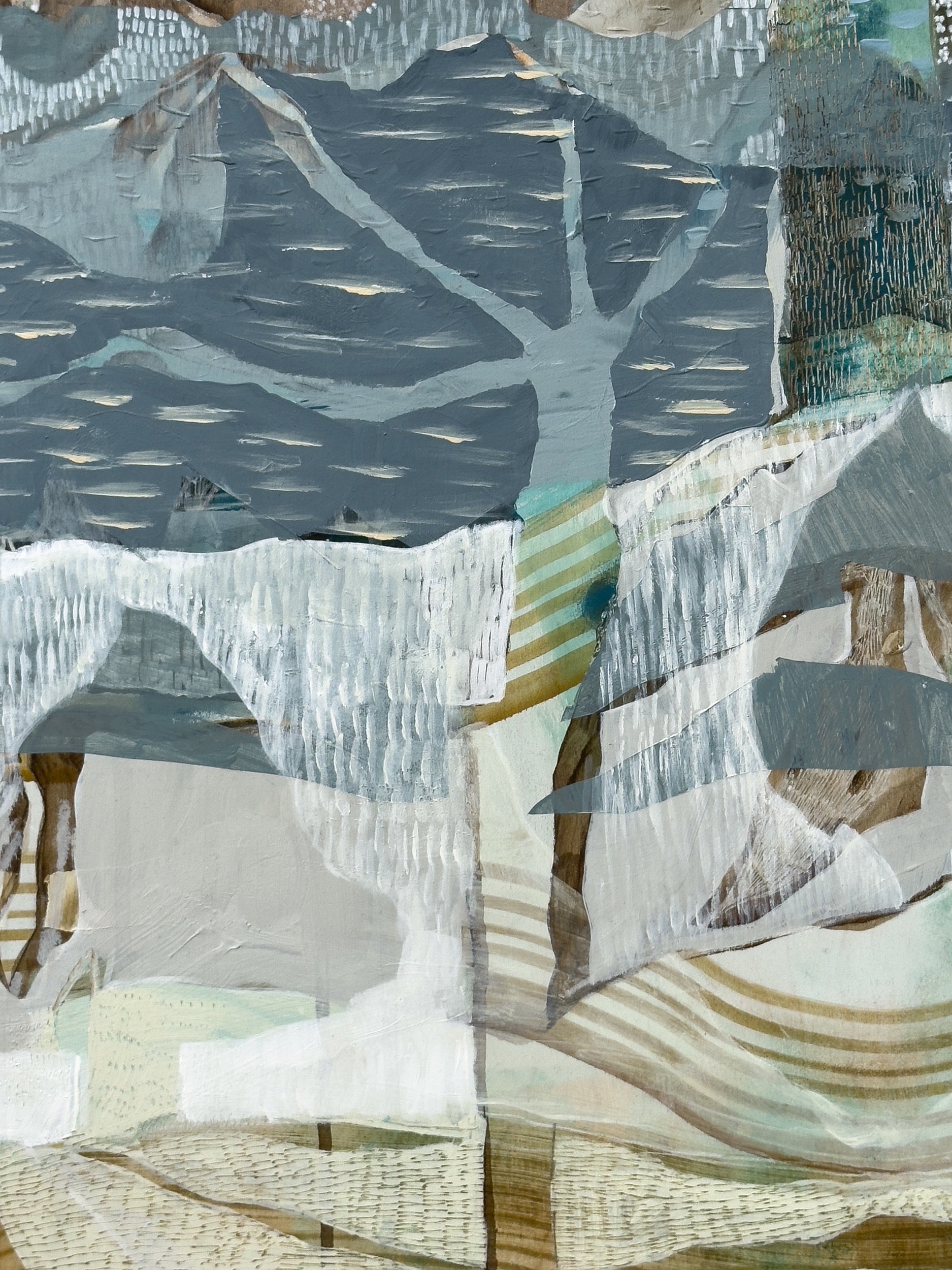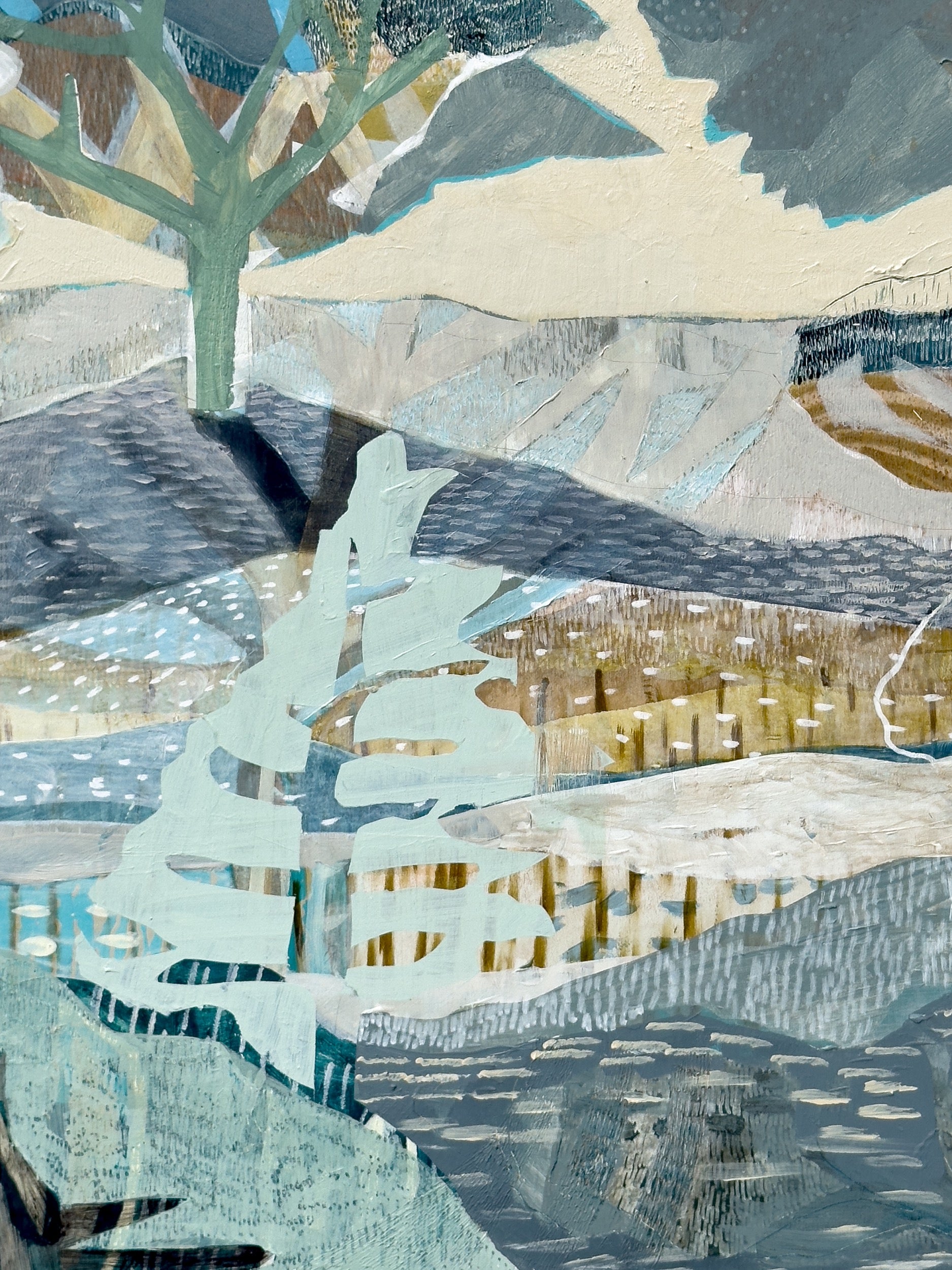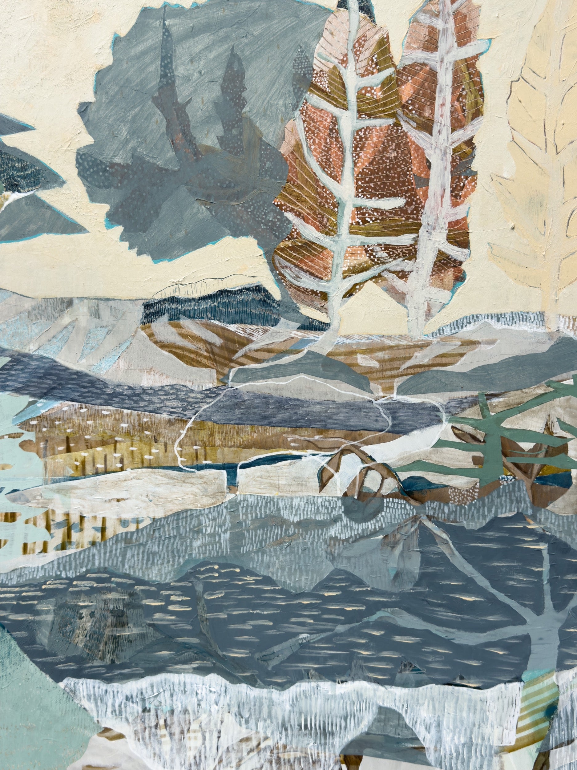 Where Dreams Begin is a textured and layered landscape that evokes a dreamlike interplay between memory and nature. Crafted with a composition almost patchwork like, a quality that feels both familiar and surreal. The overlapping layers suggest movement and depth, inviting viewers into a contemplative world where boundaries blur between reality and imagination. This work captures a gentle stillness, encouraging a reflective pause-as if you have wandered into a serene woodland where stories might quietly unfold.
